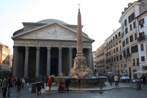 Rome, Italy. The Pantheon, interior rotunda. The oculus (opening) at the top provides the only significant light inside. The weight of the concrete dome is lightened with the five rows of coffers (sunken squares). The dome is a perfect half hemisphere, and if replicated on the bottom half would just touch the original floor when creating a full sphere.