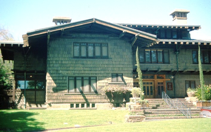 By the 1890s the bungalow form in America had diffused to the West Coast, particularly via San Francisco and southern California. It is the so-called California Bungalow that became the rage in pattern books across the nation and was reproduced into the various forms of middle- and working-class housing (and some elaborate, high-style examples). The popularizing of the west-coast bungalow has been generally credited to the Greene and Greene brothers and their architectural firm in Pasadena, CA. In 1902-1903, Charles and Henry Greene were influenced by the vernacular style of board and shingle buildings in California as well as authentic Japanese sources. One clear source for the brothers was the Japanese Hooden exhibit at the Chicago World’s Fair (Columbian Exposition) in 1893. The brothers depended most on wooden construction. Their principal achievements in wood construction consisted of four luxurious houses designed between 1907-1909: 1) Blacker House, Pasadena; 2) Gamble House, Pasadena; 3) Thorsen House, Berkeley; 4) Pratt House, Ojai.