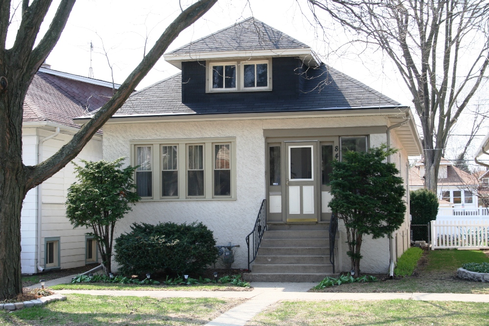 Forest Park, IL. Smaller bungalow with pyramidal roof and dormer, with modest corner porch. Ribbon windows (set of 3-over-1 craftsman windows) start to appear here, more common with later international style buildings.