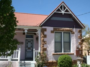 Las Vegas, NM. Typical folk-victorian L-shaped floor plan with corner porch, simplified vergeboard, and decorative quoins.