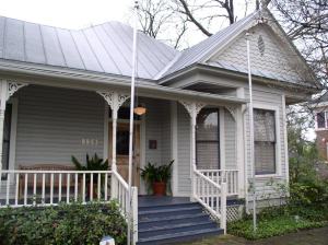 San Antonio, TX. Prominent features include the cantilevered gable over the bay window, L-shaped floor plan, patterned siding on the gable, clapboard siding, single-pane sash windows, and porch with latticework. Basically a miniature version of Queen Anne style.