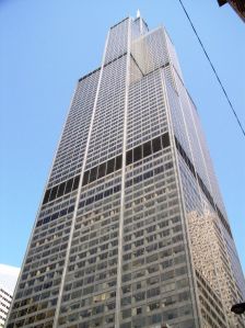 Chicago, IL. The Willis Tower (formerly the Sears Tower), c.1970-73. Designed by Skidmore, Owings & Merrill as a “tube building,” with nine individual tubes in a 3×3 matrix, each lower tube providing structural support for the upper ones. America’s tallest building, with 108 stories.