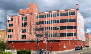 Flagstaff, AZ. The Bank of America Building, c.1961. This is a typical appearance and design for international-style office towers of the 1960s, small and large. Includes plate glass windows separated between the floors by spandrel panels (red).