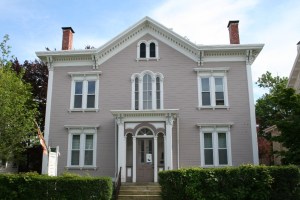 New Bedford, MA. Ivory Bartlett, Jr. House, c.1857. Includes the Italianate entryway and porch, double-arched windows on second floor and side gable, and pendant brackets (rare) hanging from the eaves. Also exhibits a central dormer with elliptical arch, reflecting the curved pediment of Italian Renaissance architecture.