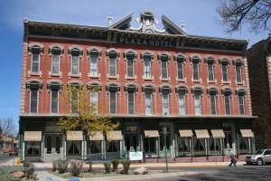 Las Vegas, NM. An Italianate hotel on the old Spanish plaza, exhibiting pedimented, tall windows, a broken pediment above the roofline, and elaborate brackets under the cornice.