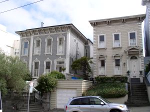 San Francisco, CA. Urban Italianate townhouses with tall, framed windows, overhanging eaves, elaborate brackets, and boxy, 2-story form.