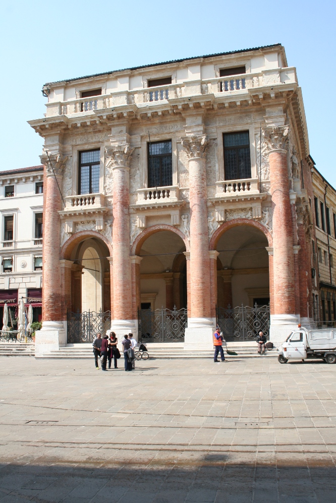 Basilica Palladiana, c.1546-1549, Vicenza, Italy. Originally built in the 1400s as the Palazzo (palace) della Ragione. This is one of the first of young Andrea Palladio’s commissions, to restore the ailing Gothic structure with a new loggia, portico, and classical figures, essentially hiding the original building. This is one of Palladio’s first (if not the first) incorporation of his so-called Palladian (or Serlian) window. This feature includes a central round-arched arcade flanked by two rectangular openings and classical columns. This form would become immensely popular throughout the next several centuries, and still shows up on 21st-century buildings.