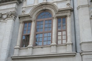 A Palladian (or Serlian) window, one of Andrea Palladio’s most famous forms, identified by a central arched window flanked by two rectangular lights (windows) set within a Classical entablature and columns. This one is part of the Baroque facade of Sant’Agnese in Agone Church, Rome.
