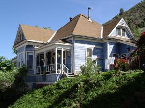 Jerome, AZ. A typical Queen Anne home in the American West, including a cross-gabled plan, cantilevered gable over bay window (left side), and decorative spindlework and vergeboard.