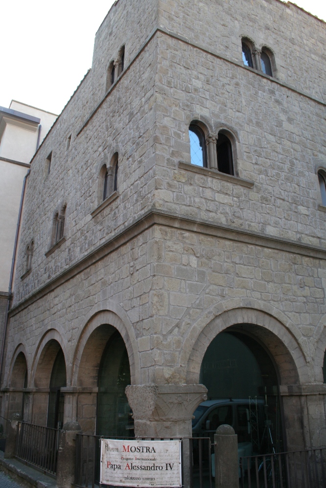 Viterbo, Italy. Large, arcaded round arches on the ground floor, with double-arched windows above. This was the typical architectural style of medieval towns like Viterbo before becoming moderately influenced by the “modern” Gothic style.