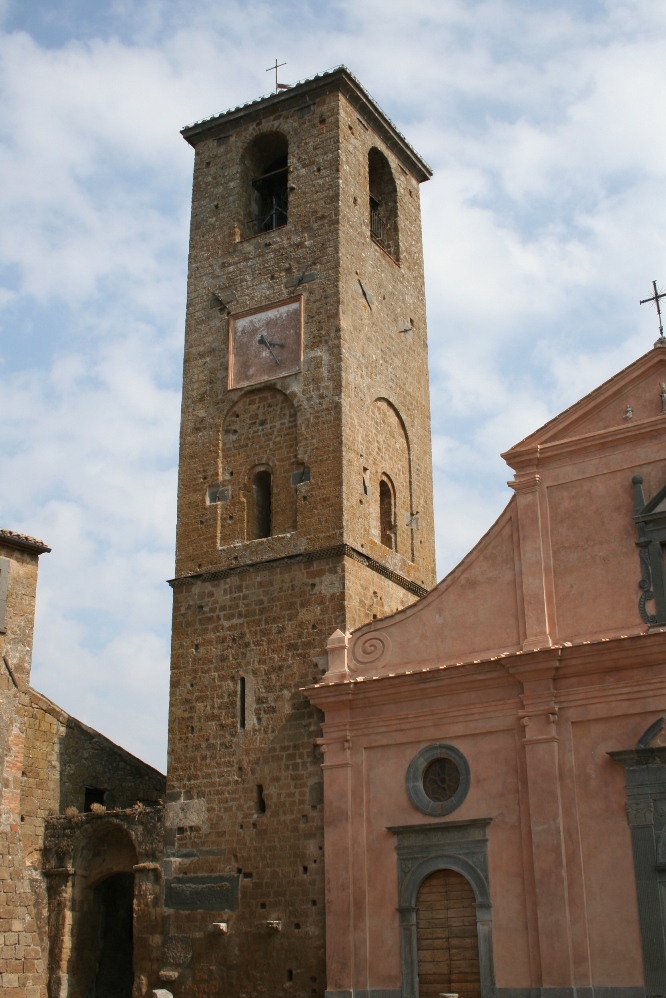 Civita di Bagnoregio, Italy. A Romanesque bell tower with its characteristic round arches, standing next to a later Renaissance-era church.