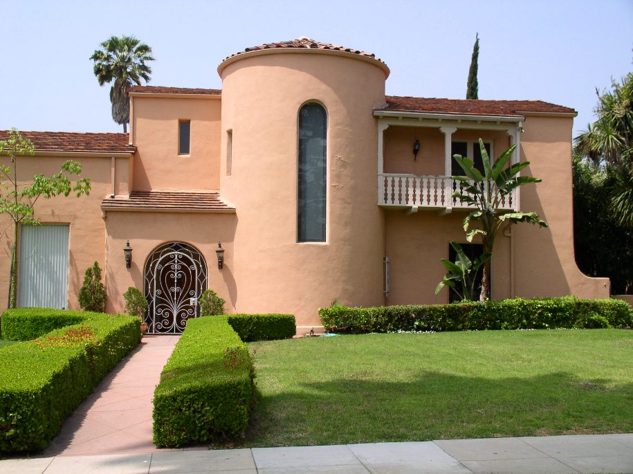 Beverly Hills, CA. This example includes a round, medieval-type tower and a projecting, second-story porch, along with the more typical stucco cladding and tile roof.