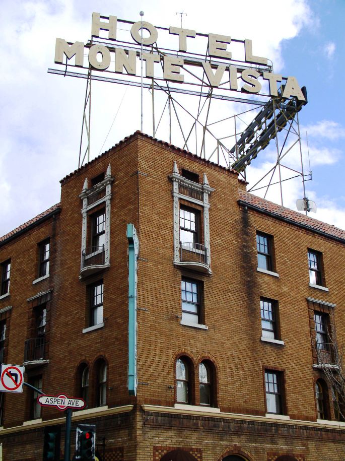 Flagstaff, AZ. c.1926. Monte Vista Hotel. A rare Spanish Revival commercial building in northern Arizona. Includes Baroque window frames, tile roof with no overhang, and unframed, double-arched windows.